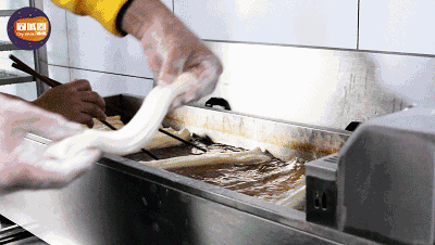 出锅:刚出炉的油条沥干油份,“咔嚓”咬一口。清脆悦耳,十分撩人
